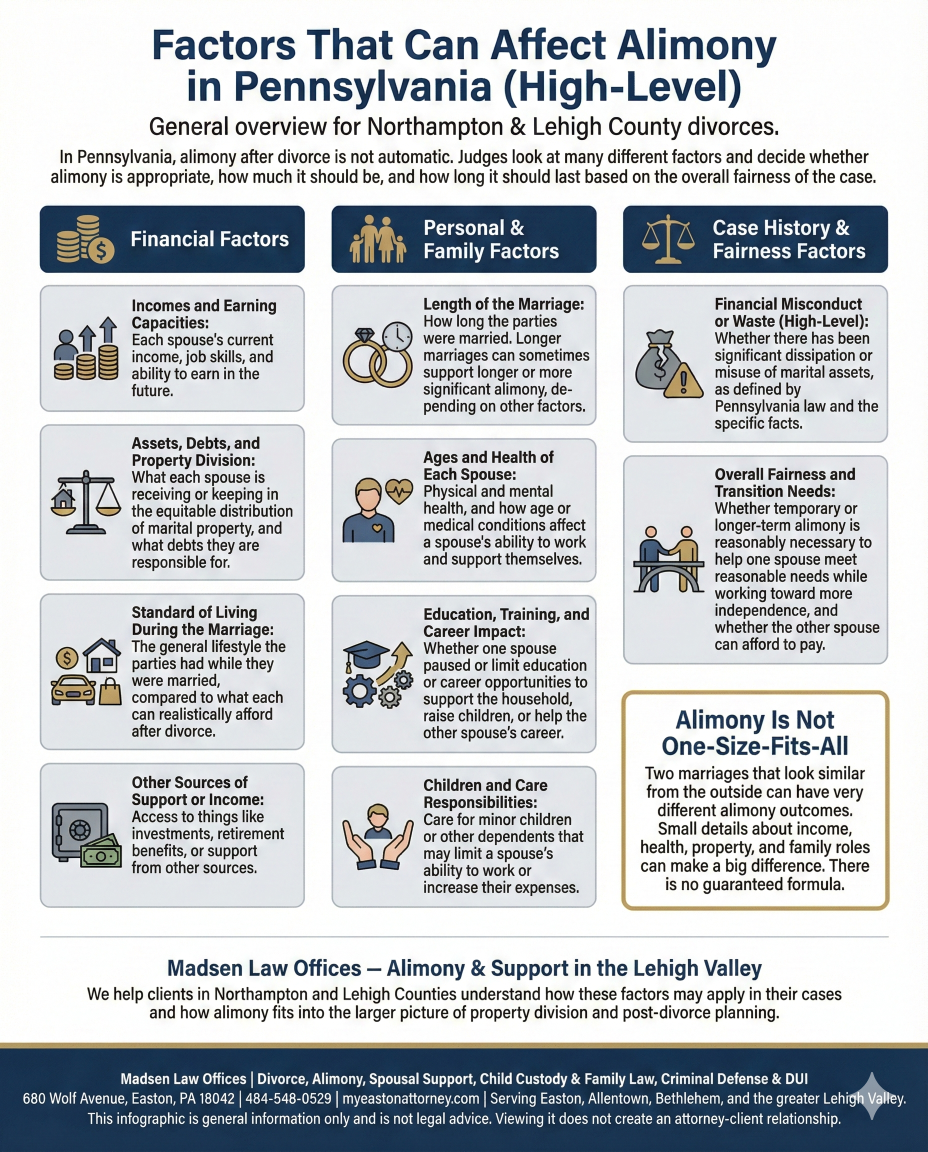 Our Easton Divorce Attorneys handle Alimony & Spousal Support cases at all levels, ranging from initial filings to appeals. We work closely with clients to review income and achieve the best possible outcome in support cases in Easton, Allentown & Bethlehem. Our Alimony Lawyers can help.